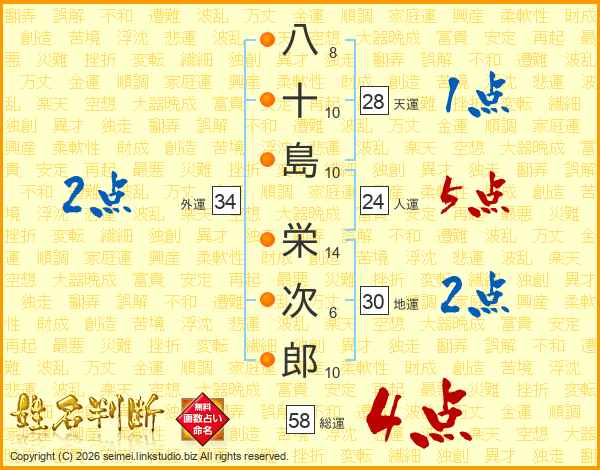 八(8画)十(10画)島(10画) 栄(14画)次(6画)郎(10画)