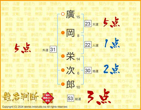廣(15画)岡(8画) 栄(14画)次(6画)郎(10画)