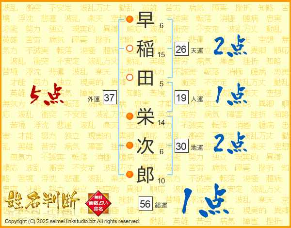 早(6画)稲(15画)田(5画) 栄(14画)次(6画)郎(10画)