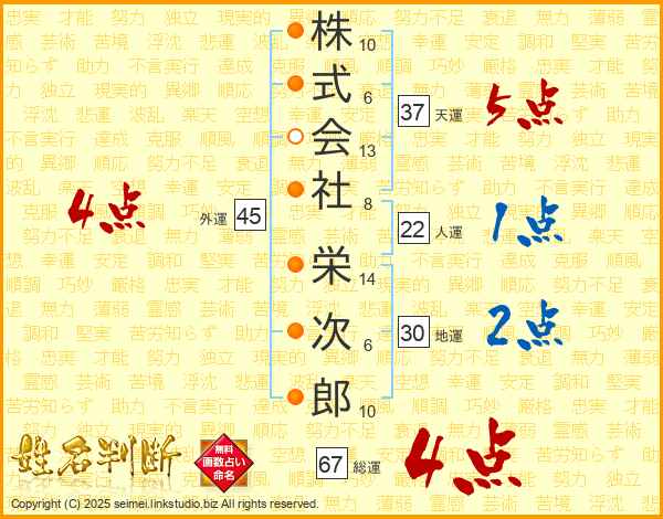 株(10画)式(6画)会(13画)社(8画) 栄(14画)次(6画)郎(10画)