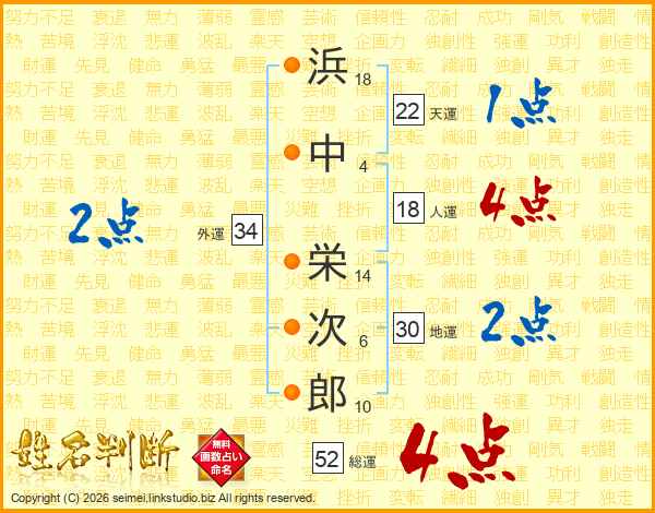 浜(18画)中(4画) 栄(14画)次(6画)郎(10画)