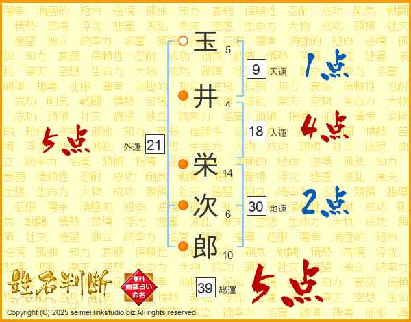 玉(5画)井(4画) 栄(14画)次(6画)郎(10画)