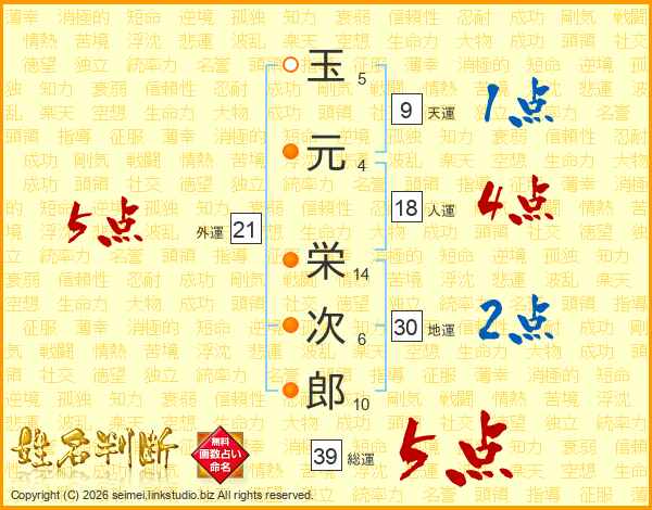 玉(5画)元(4画) 栄(14画)次(6画)郎(10画)