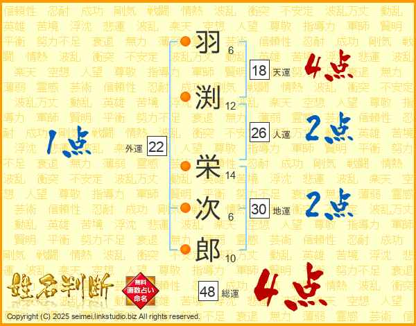 羽(6画)渕(12画) 栄(14画)次(6画)郎(10画)