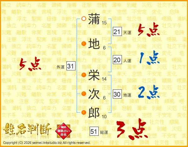 蒲(15画)地(6画) 栄(14画)次(6画)郎(10画)