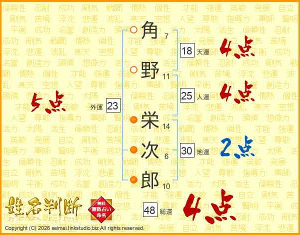 角(7画)野(11画) 栄(14画)次(6画)郎(10画)