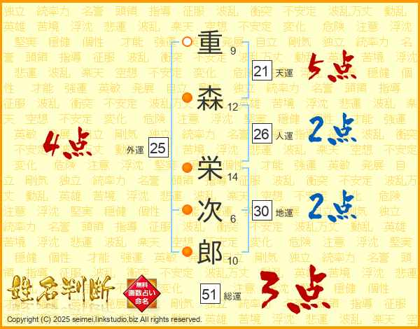 重(9画)森(12画) 栄(14画)次(6画)郎(10画)