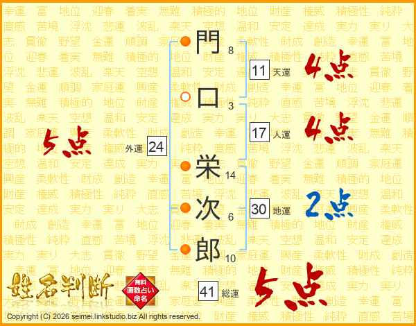 門(8画)口(3画) 栄(14画)次(6画)郎(10画)