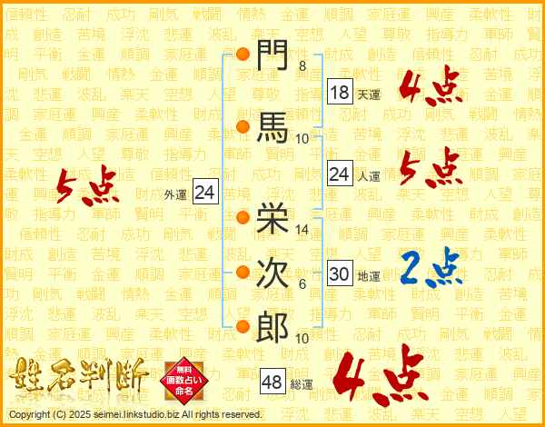 門(8画)馬(10画) 栄(14画)次(6画)郎(10画)