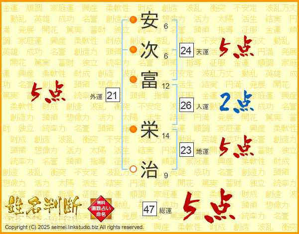 安(6画)次(6画)富(12画) 栄(14画)治(9画)
