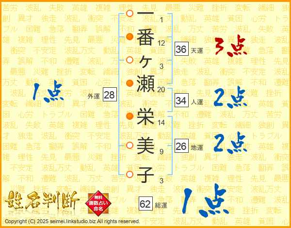 一番ヶ瀬栄美子さんの天運は36画の3点!