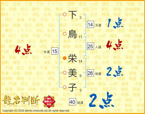下(3画)鳥(11画) 栄(14画)美(9画)子(3画)
