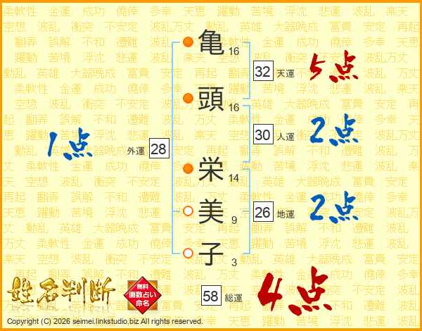 亀(16画)頭(16画) 栄(14画)美(9画)子(3画)