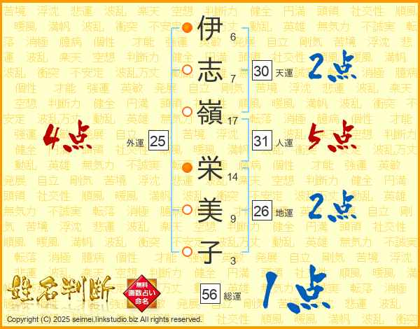 伊(6画)志(7画)嶺(17画) 栄(14画)美(9画)子(3画)