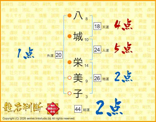 八(8画)城(10画) 栄(14画)美(9画)子(3画)