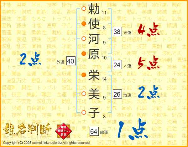 勅(11画)使(8画)河(9画)原(10画) 栄(14画)美(9画)子(3画)