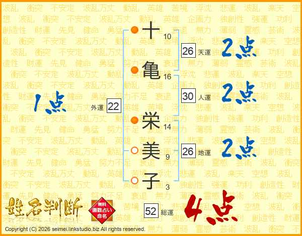 十(10画)亀(16画) 栄(14画)美(9画)子(3画)