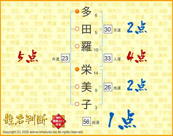 多(6画)田(5画)羅(19画) 栄(14画)美(9画)子(3画)
