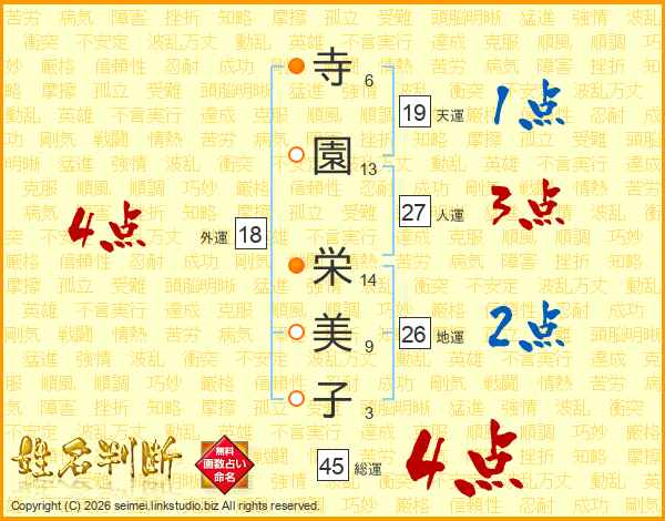 寺(6画)園(13画) 栄(14画)美(9画)子(3画)