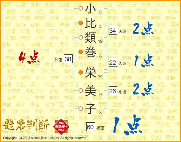 小(3画)比(4画)類(19画)巻(8画) 栄(14画)美(9画)子(3画)