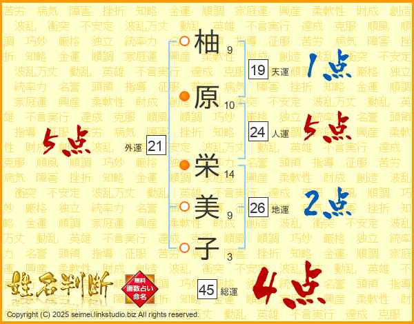 柚(9画)原(10画) 栄(14画)美(9画)子(3画)