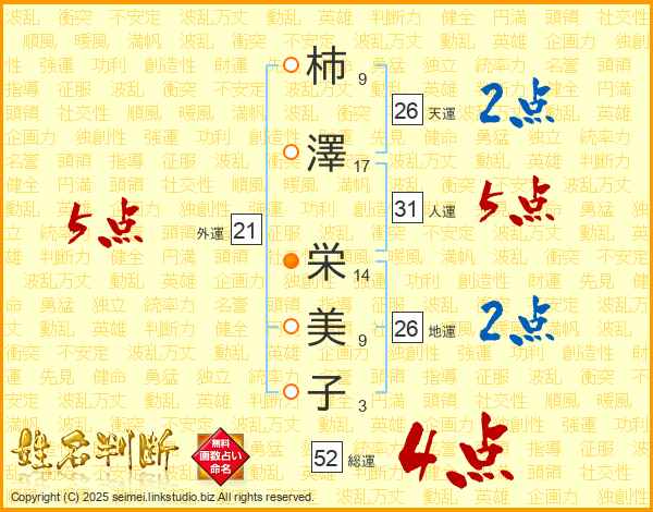 柿(9画)澤(17画) 栄(14画)美(9画)子(3画)