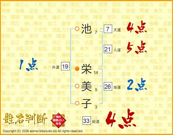 生活面を象徴する運勢です。外部から受ける影響力を表し、結婚運、家庭運や職場、環境への順応性を表します。総運から人運を引いた画数。姓や名が1文字の場合を除く。