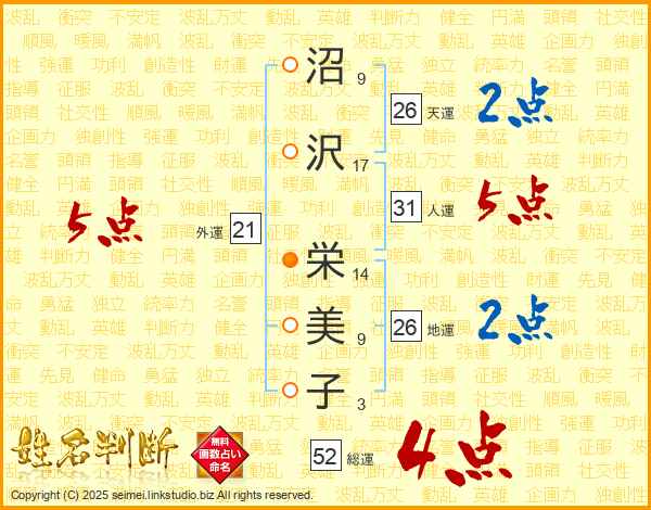 沼沢栄美子さんの総運は52画の4点!