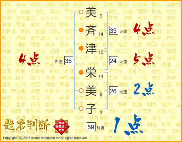 美(9画)斉(14画)津(10画) 栄(14画)美(9画)子(3画)