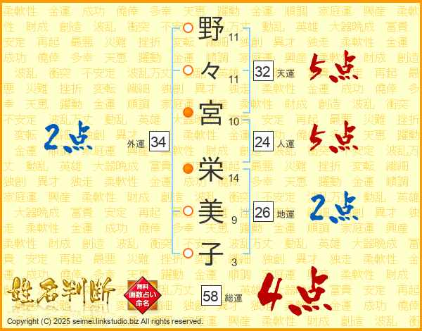 野(11画)々(11画)宮(10画) 栄(14画)美(9画)子(3画)