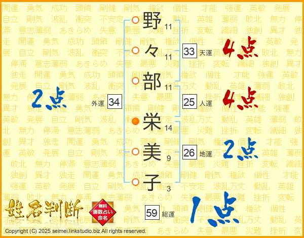 野(11画)々(11画)部(11画) 栄(14画)美(9画)子(3画)