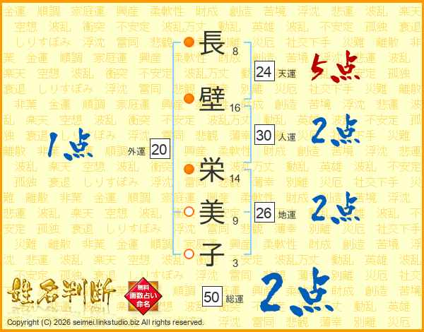 長(8画)壁(16画) 栄(14画)美(9画)子(3画)