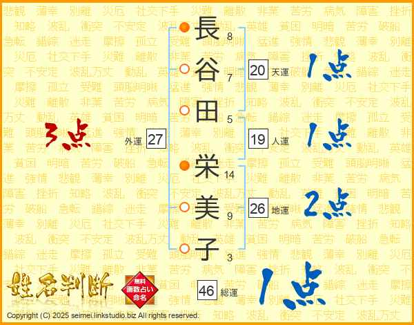 長(8画)谷(7画)田(5画) 栄(14画)美(9画)子(3画)