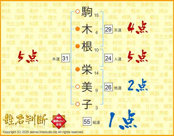 駒(15画)木(4画)根(10画) 栄(14画)美(9画)子(3画)