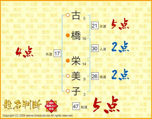 古(5画)橋(16画) 栄(14画)美(9画)子(3画)