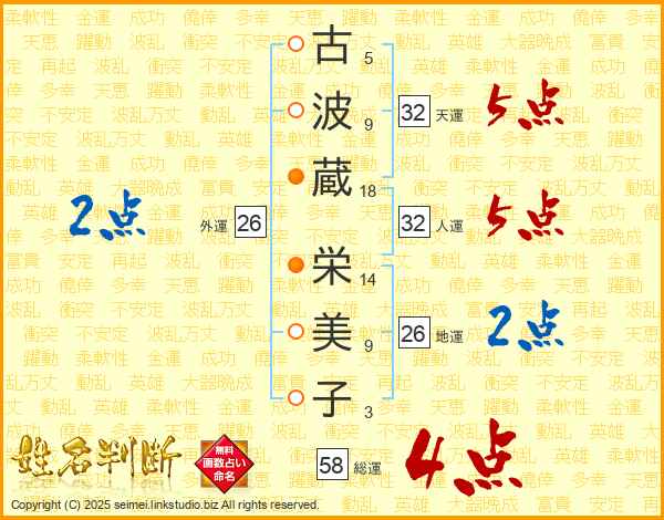 古(5画)波(9画)蔵(18画) 栄(14画)美(9画)子(3画)