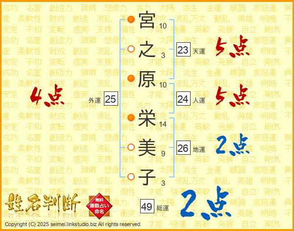宮(10画)之(3画)原(10画) 栄(14画)美(9画)子(3画)