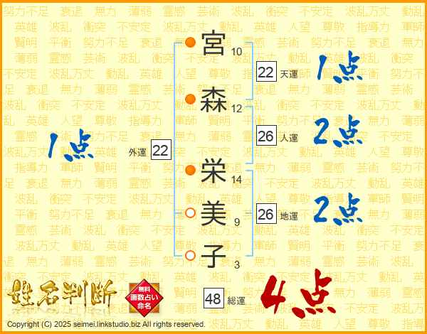 宮(10画)森(12画) 栄(14画)美(9画)子(3画)