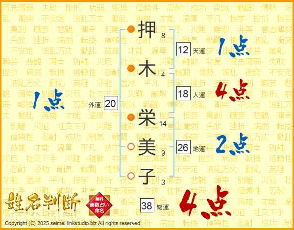 押(8画)木(4画) 栄(14画)美(9画)子(3画)