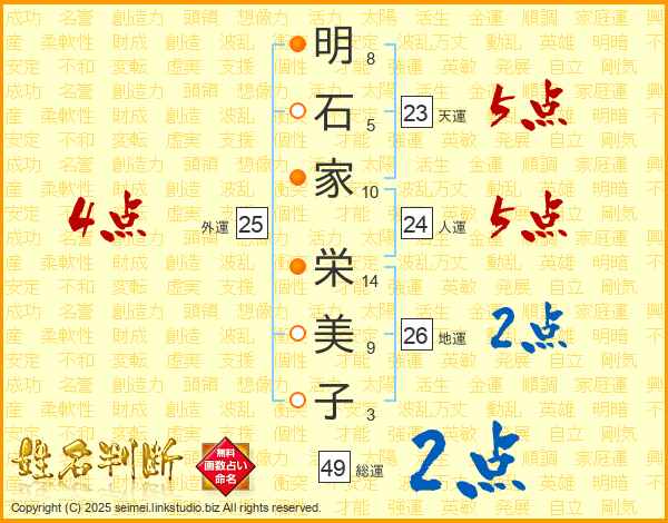 明(8画)石(5画)家(10画) 栄(14画)美(9画)子(3画)