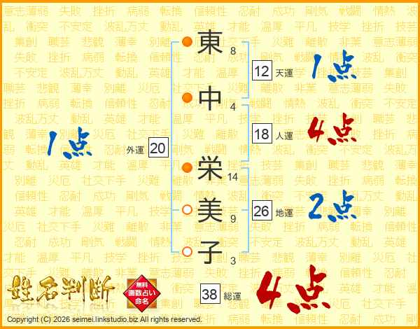 東(8画)中(4画) 栄(14画)美(9画)子(3画)