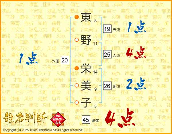 東(8画)野(11画) 栄(14画)美(9画)子(3画)