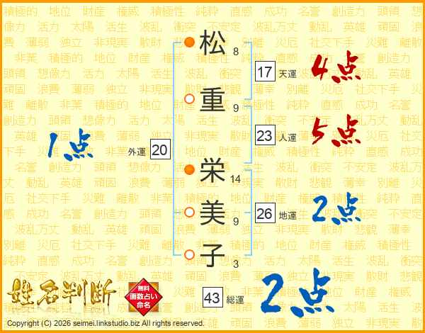 松(8画)重(9画) 栄(14画)美(9画)子(3画)