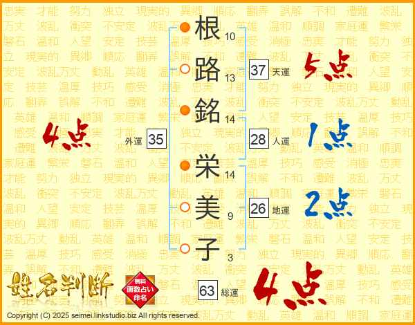 根(10画)路(13画)銘(14画) 栄(14画)美(9画)子(3画)