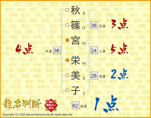 秋(9画)篠(17画)宮(10画) 栄(14画)美(9画)子(3画)