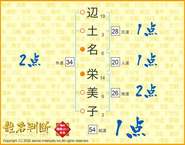 辺(19画)土(3画)名(6画) 栄(14画)美(9画)子(3画)