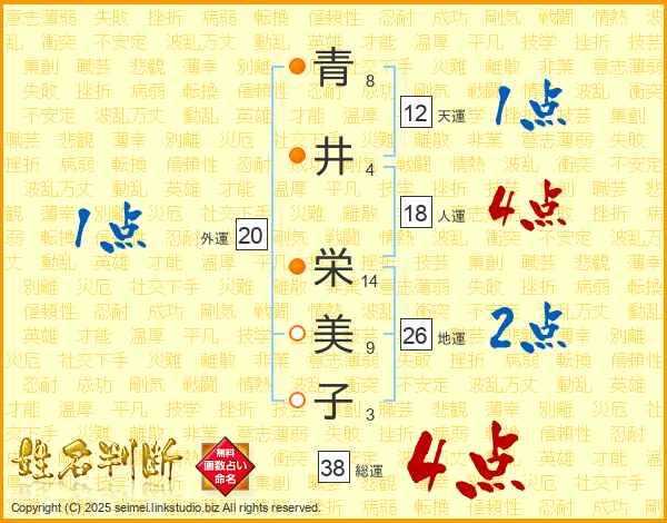 青(8画)井(4画) 栄(14画)美(9画)子(3画)