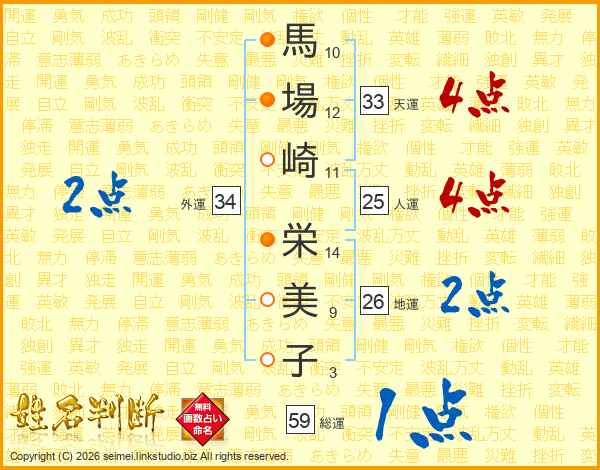 馬(10画)場(12画)崎(11画) 栄(14画)美(9画)子(3画)