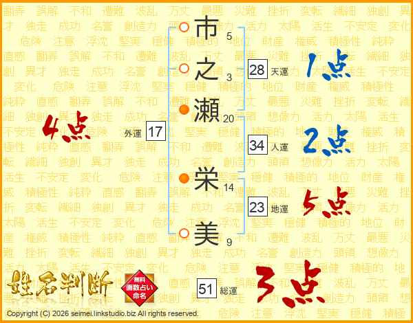市(5画)之(3画)瀬(20画) 栄(14画)美(9画)
