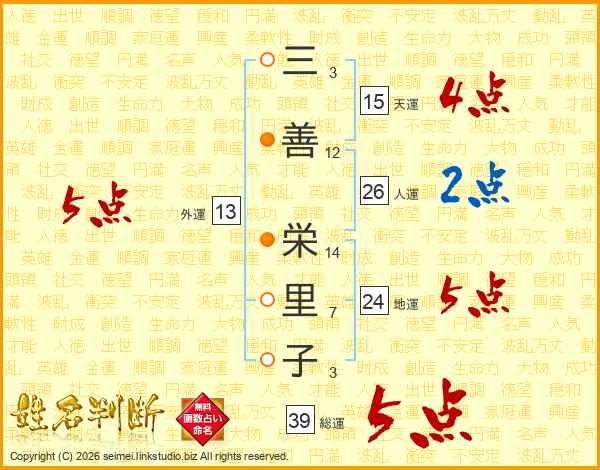 三(3画)善(12画) 栄(14画)里(7画)子(3画)